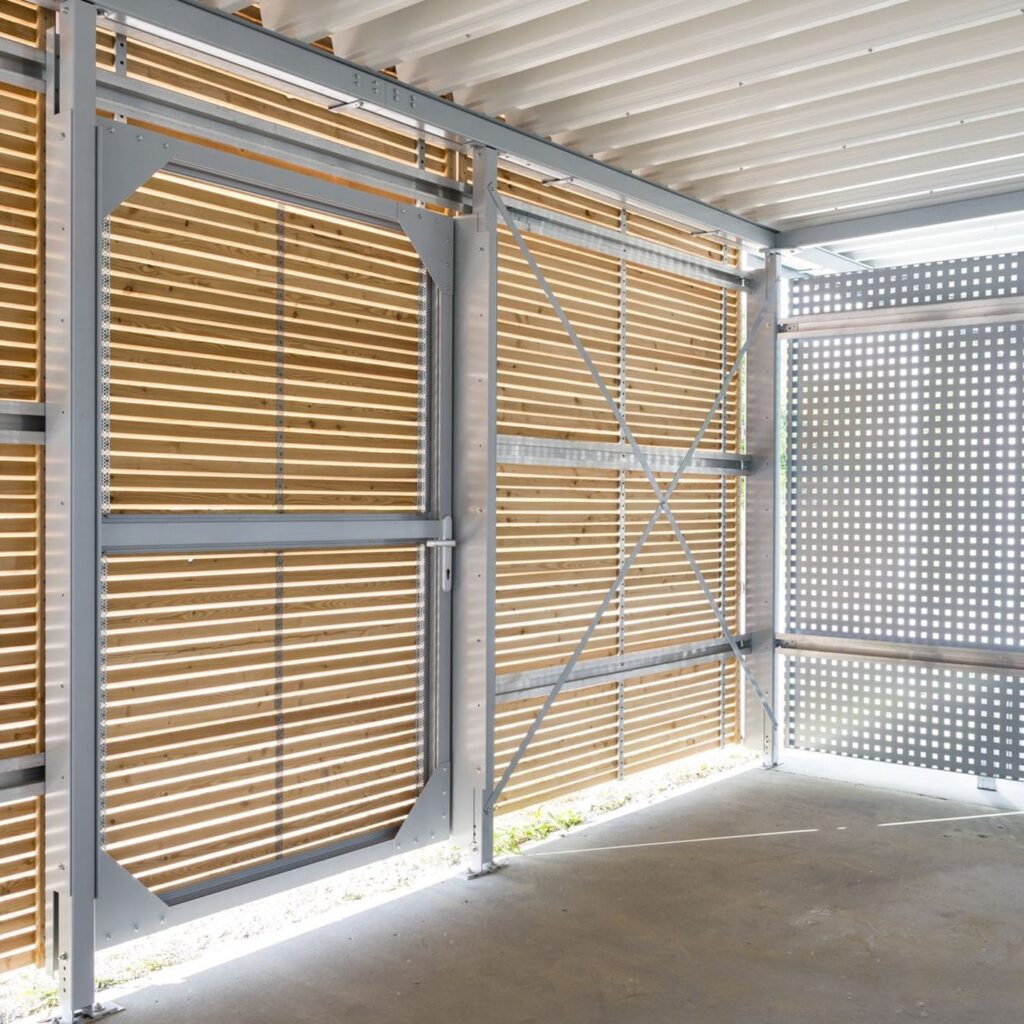 Der Abstand der Metallpaneele zum Boden gewährleistet eine gute Luftzirkulation, ohne den Schutz gegen Schlagregen zu beeinträchtigen. Daraus resultiert ein gutes Innenraumklima, in dem die Fahrräder und E-Bikes auch bei Regen und Schnee gut abtrocknen. Durch die Oberflächenbehandlungen sind die stoßfesten Metallpaneele ebenso korrosionsbeständig wie das feuerverzinkte Stahltragwerk. Ihre Werte bleiben auf diese Weise dauerhaft geschützt, während wir zugleich eine lange Lebensdauer der Fahrradgarage sicherstellen.