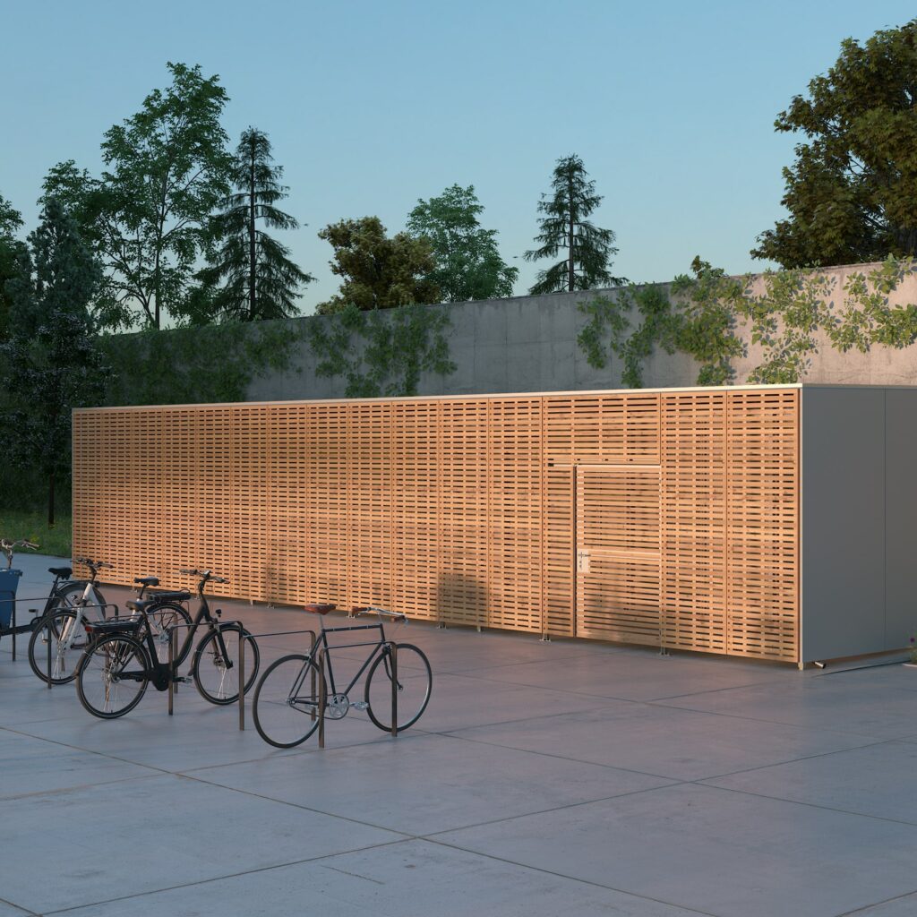 Our bicycle garages with wooden façade panels blend harmoniously into any residential, office or commercial environment. Whether free-standing in a green area or as an extension to an existing building - the natural building material wood and the wide range of customisation options (such as the green roof) always give them a pleasant and scaled external appearance.
