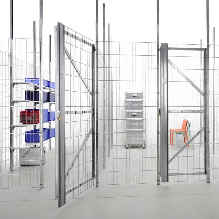 180° öffnend, aushängesichere Bänder (zweiteilig), vorgerichtet für Vorhängeschloss, lichte Durchgangsbreite mit bis zu 1250 mm, Standardsystemhöhe 1900/2050/2250 mm, alle Stahlteile feuerverzinkt